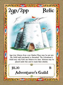 Innate Ability: 2gp (2 gold peices) = Any Minion from your Market Place may be put into the Guild until purchased or discarded. The Adventurer’s Guild may only hold one Minion at a time. Minions may be placed under this card to mask their identity.