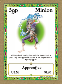 Innate Ability: All Mage Spells cost 1pp (1 power point) less while the Apprentice is in play. Only one Apprentice may be in the Mage’s service. Upkeep 1pp / R (1 power point per round)