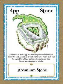 Innate Ability: This Stone is worth 4pp (4 power points) and must be purchased before use. It may be used AT (any trun) and is discarded after use. Stones may only be carried by a Mage and do not count as an Item. Stones are not subject to attacks.