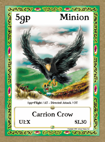 Play Notes: The Carrion Crow can do a normal melee attack or you can direct it toward a target of choice when you pay for flight on your turn. The Carrion Crow may block flying enemies if you pay its flight cost of 1 power point on any turn.