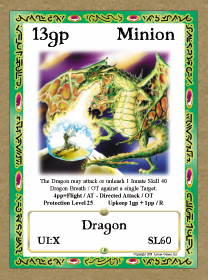 Innate Ability: The Dragon may attack or unleash 1 Innate Skill 40 Dragon Breath / OT (On Turn) against a single Target. 4pp = Flight / AT (Any Turn) - Directed Attack / OT (On Turn). Protection Level 25. Upkeep 1 gold piece + 1 powerpoint per round.