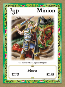 Play Notes: The Hero is adept at battle and is an expert at slaying Dragons. When in combat with a Dragon, the Hero has as a Skill Level 55. The hero can use any Item and is a great addition to any army.