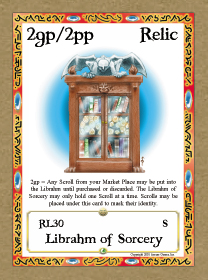 Innate Ability: 2gp (2 gold peices) = Any Scroll from your Market Place may be put into the Librahm until purchased or discarded. The Librahm of Sorcery may only hold one Scroll at a time. Scrolls may be placed under this card to mask their identity.
