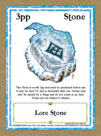 Innate Ability: This Stone is worth 3pp (3 power points) and must be purchased before use. It may be used AT (any trun) and is discarded after use. Stones may only be carried by a Mage and do not count as an Item. Stones are not subject to attacks.