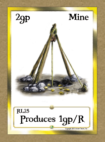 Play Notes: Once purchased, the Mine is placed on the Caravan and is usable on your next turn. Unlike Base Mines, the Marketplace Mine can be destroyed by certain Scrolls and Spells. Having an abundance of Mines in your Market Deck will allow you to quickly build up your purchasing power. Mines produce 1 gold piece every round. This means at the begining of your turn, any Mines that were placed in the Spent Gold pile are now replenished and usable again. Gold pieces are used to buy Items, Relics, hire Minions and activate some innate abilities.