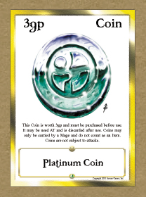 Innate Ability: This Coin is worth 3gp (3 gold pieces) and must be purchased before use. It may be used AT (any turn) and is discarded after use. Coins may only be carried by a Mage and do not count as an Item. Coins are not subject to attacks.