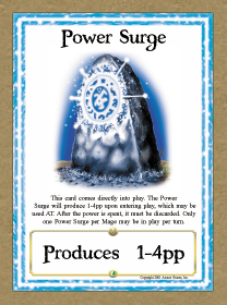 Innate Ability: This card comes directly into play. The Power Surge will produce 1-4 power points upon entering play, which may be used any turn. After the power is spent, it must be discarded. Only one Power Surge per Mage may be in play per turn.