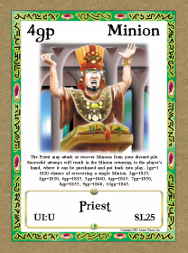Play Notes: When the Priest is in play on your turn, he can either attack an opponent or you can pay 2-10 gold pieces and attempt to recover any Minion(s) of choice from your discard pile. The more gold