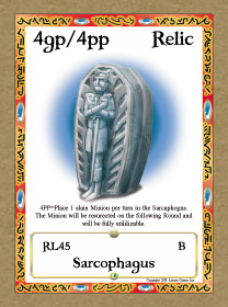Play Notes: The Sarcophagus is used to heal a defeated Minion. The Minion would normally be discarded, but is now usable at the begining of your next turn. When used in conjunction with the Altar of Power, this combination is very lucrative for generating power points. An example of